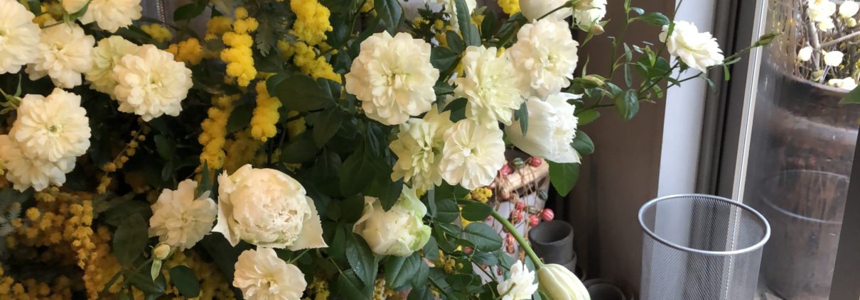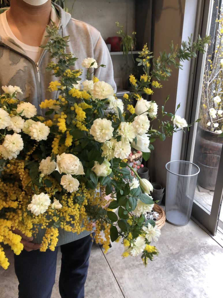 ミモザアカシアとグリーンアイスを使ったアレンジメントです。