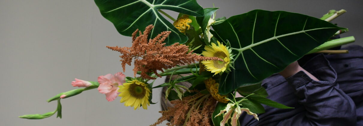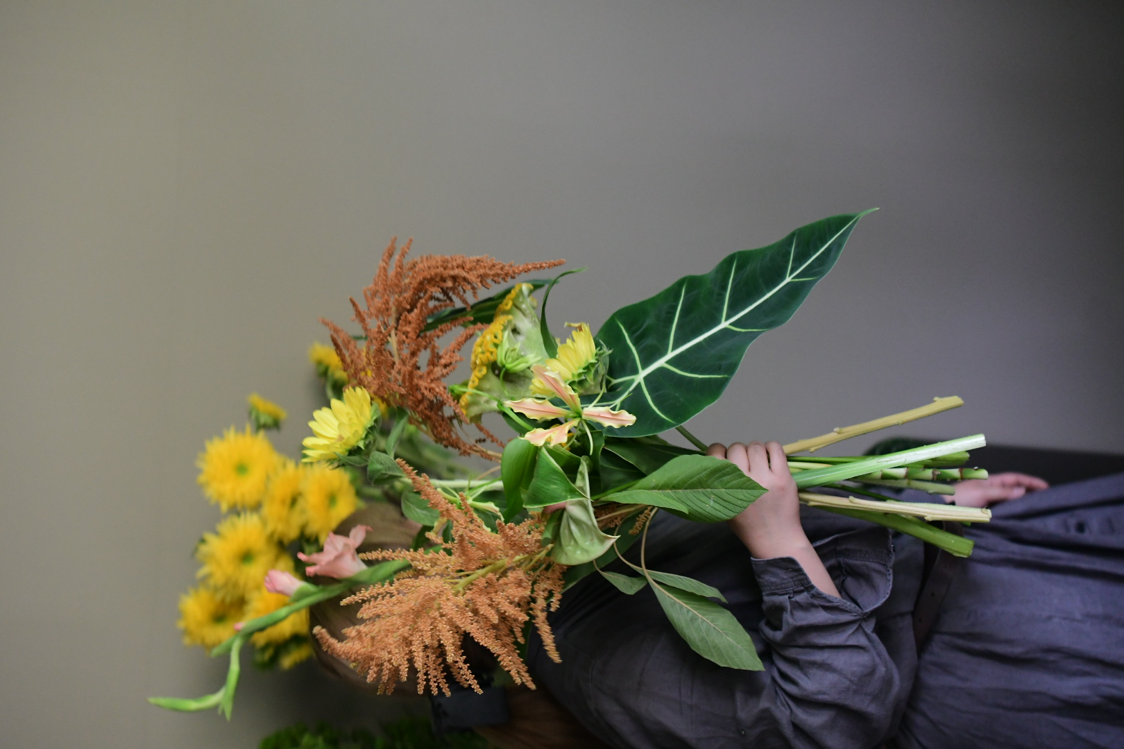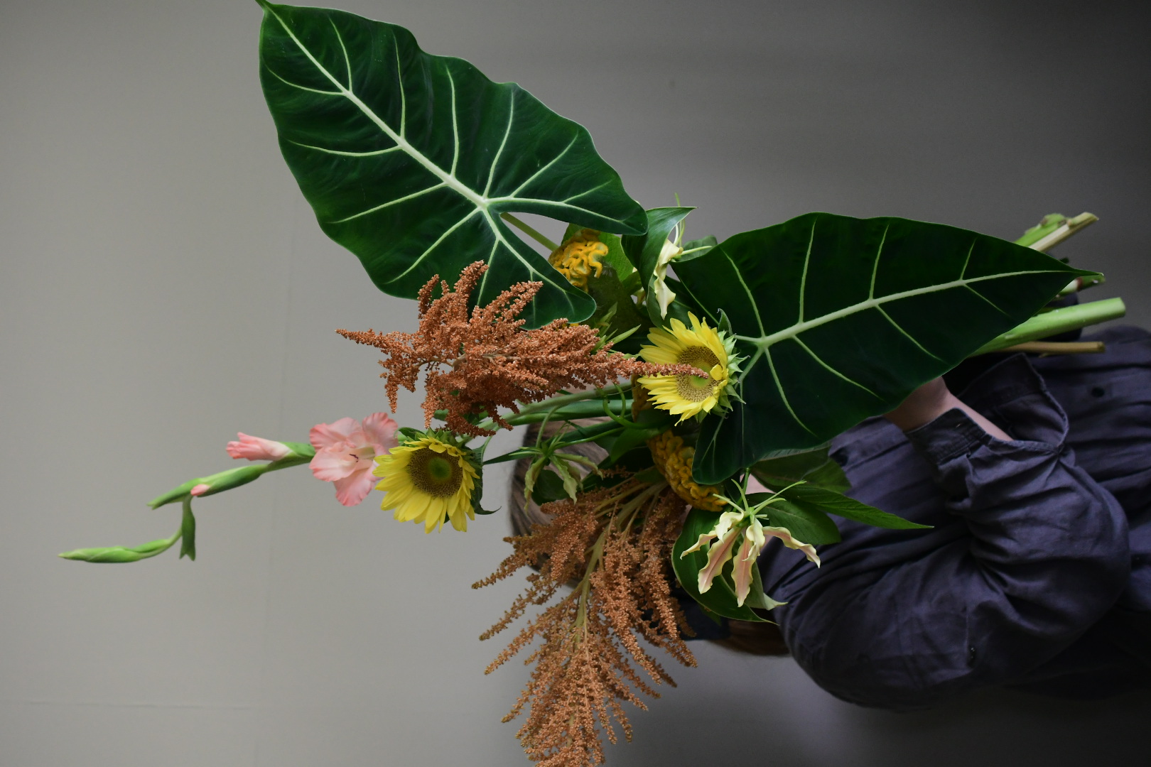 写真は男性用の花束エキゾチックなイメージで大胆な葉物使いがとても好き
